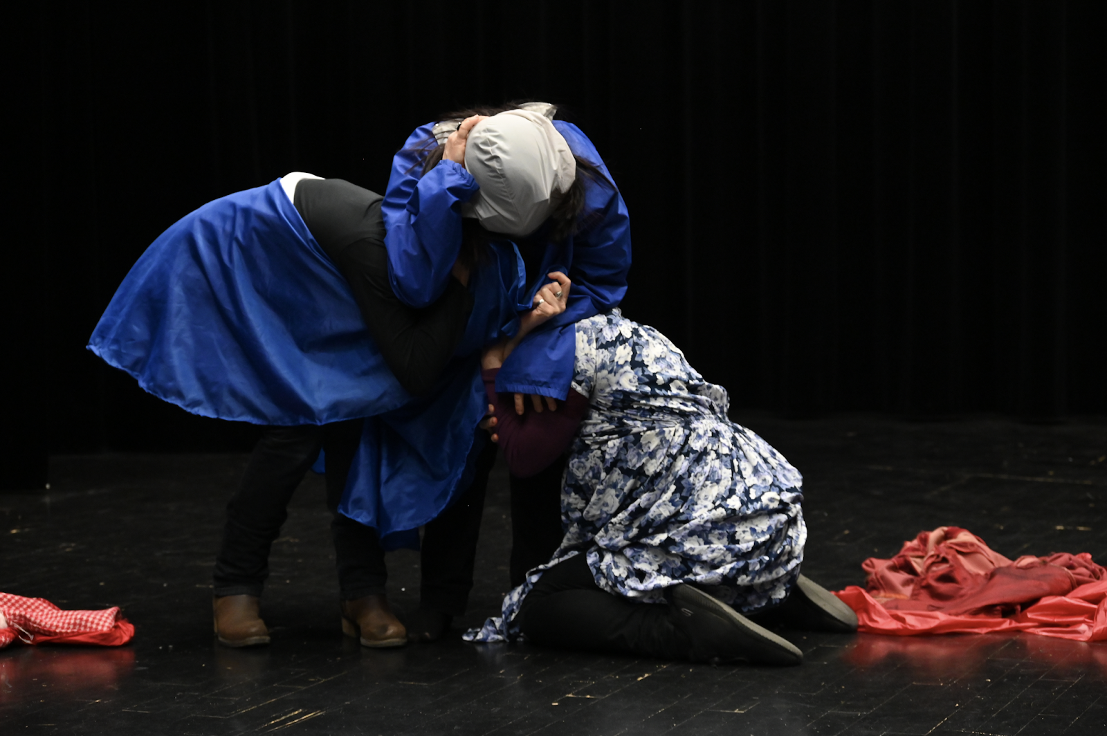 L’entrée en scène évoque un enterrement. Il serait possible d’ajouter un son, (pleureuses, sanglots ? puis respirations). Le moindre écart se remarque , le bout de tissu rouge qui dépasse, les chaussettes roses ou les baskets dorées ! Les chairs alors deviennent aussi costumes, il vaut mieux mettre les mains dans les poches. La matière rigide des imperméables noirs peut aussi être utilisée et accentuer les respirations avec les épaules qui bougent, même de dos.
